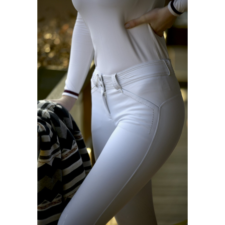 Pantalon d'équitation déperlant. Deux poches sur le devant surmontées d'un point sellier ainsi que les passants de la ceinture large. Antidérapant logoté à l'intérieur des genoux. Fermeture par deux boutons pressions argenté et une fermeture éclair. Bas de jambe en lycra.